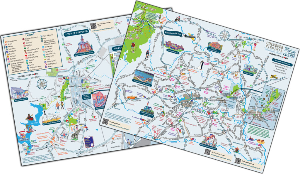 In collaboration with Culpeper Tourism and Town Economic Development, this thoughtful design project will enrich visitors’ journeys through Culpeper County. This map serves as a colorful guide, spotlighting both well-known attractions and tucked-away treasures. The map beautifully showcases Culpeper’s rich Civil War battlefields, colonial-era structures, the county’s celebrated wineries and breweries, and outdoor havens including Lake Culpeper Adventure. With artistic illustrations, visitors can easily locate the Library of Congress Packard Campus for Audio—Visual Conservation, parks, and accommodations that earned Culpeper recognition as the “Prettiest Town in Virginia.”